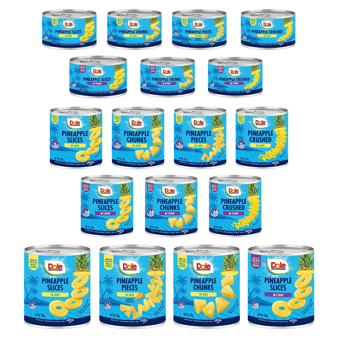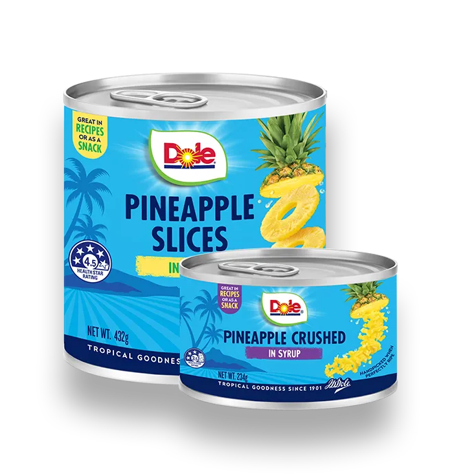 Dole is the most-loved brand of Canned Pineapple in New Zealand. There’s a product to suit every occasion, with Pineapple Slices, Chunks, Pieces or Crushed packed in pineapple juice or syrup, in different can sizes. So whether you’re making burgers, stir fries, baking or simply snacking, Dole Pineapple is the ideal choice.