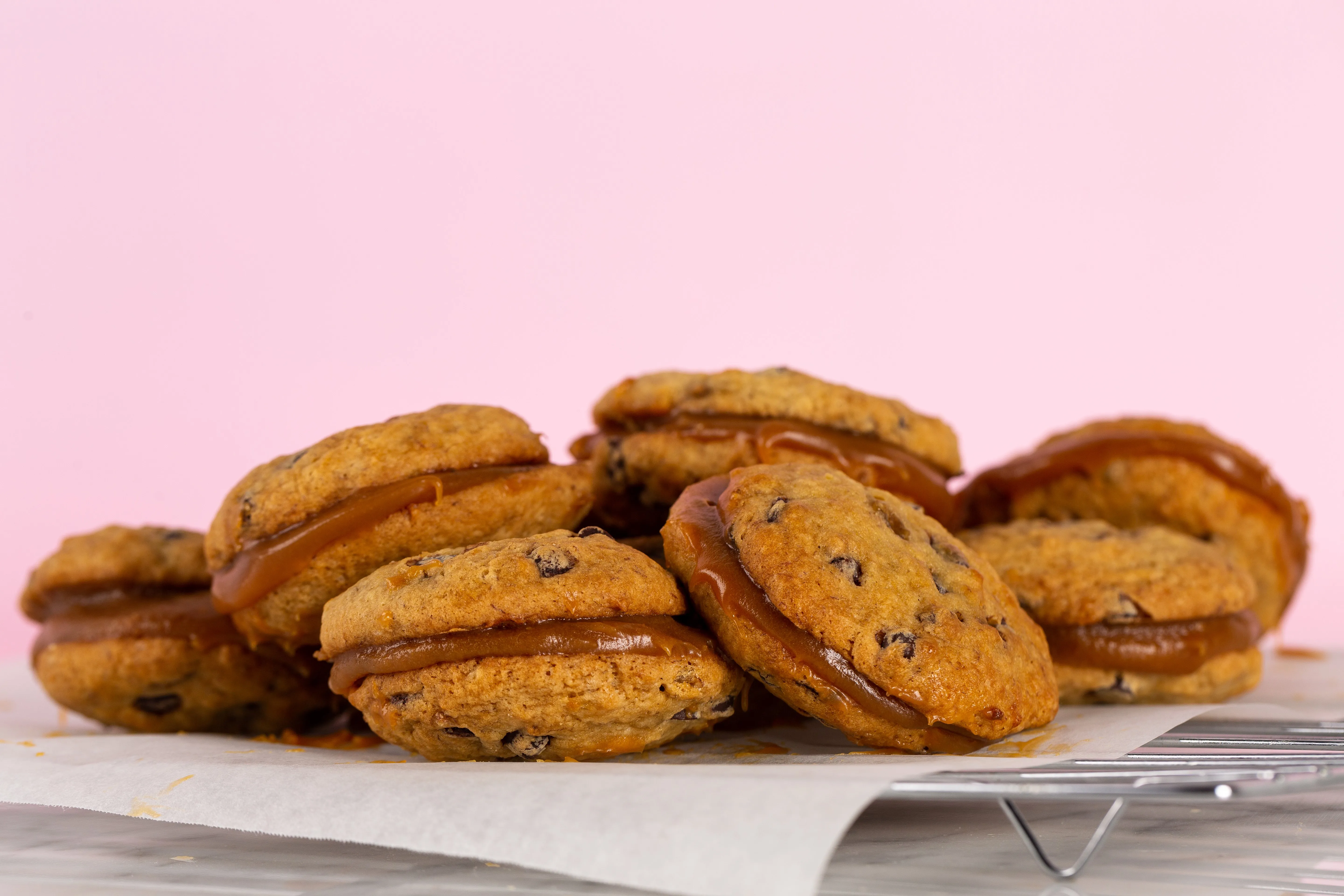 Remove from oven and leave on trays to cool completely. Once cold, sandwich together with salted caramel.