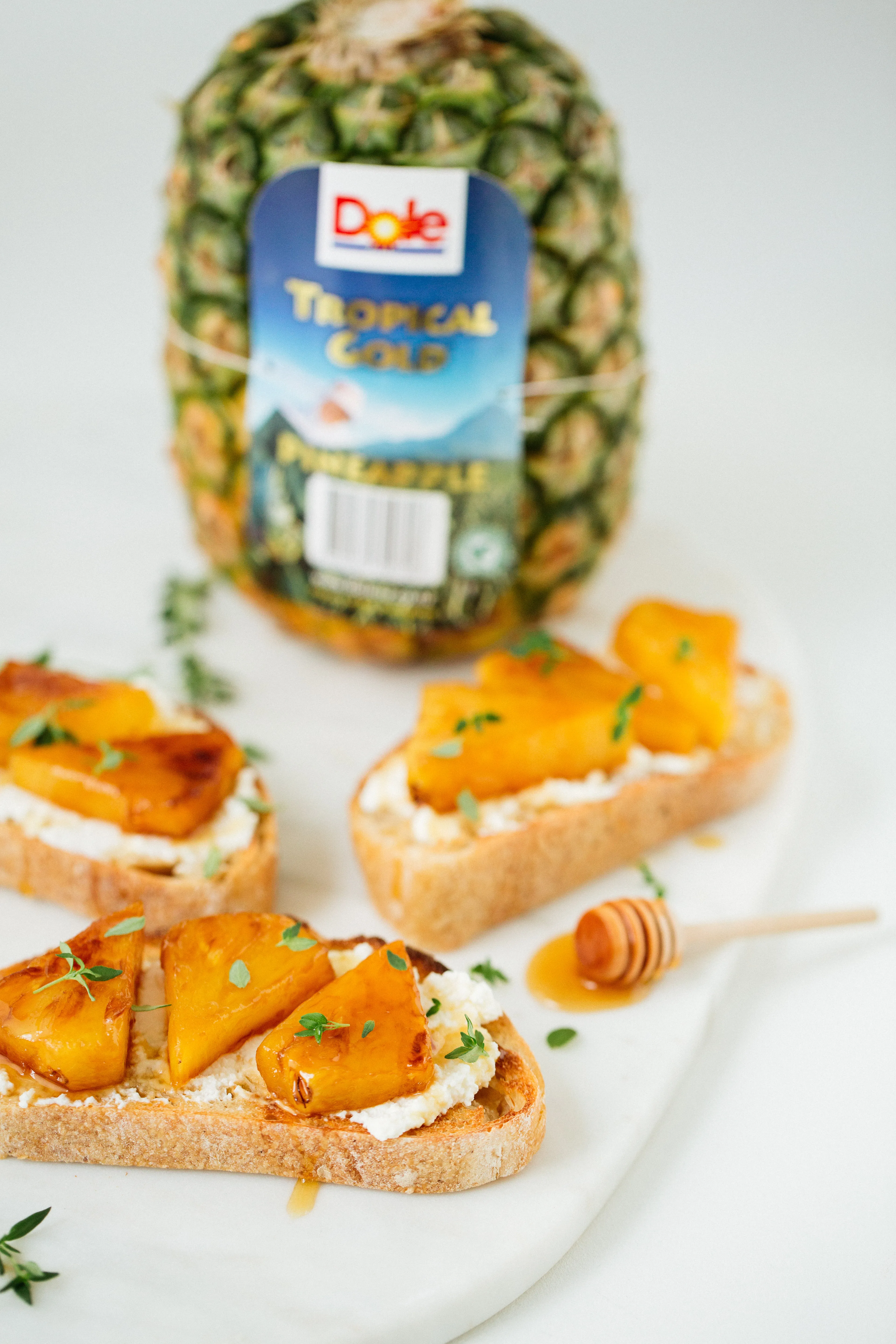Place caramelised pineapple and top with a drizzle of honey and fresh thyme leaves.