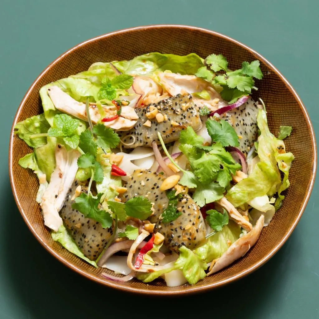 To the noodles, add lettuce, mint, coriander, red onion, and chilli. Add sliced smoked chicken and charred dragon fruit. Drizzle over most of the dressing and toss gently to coat.