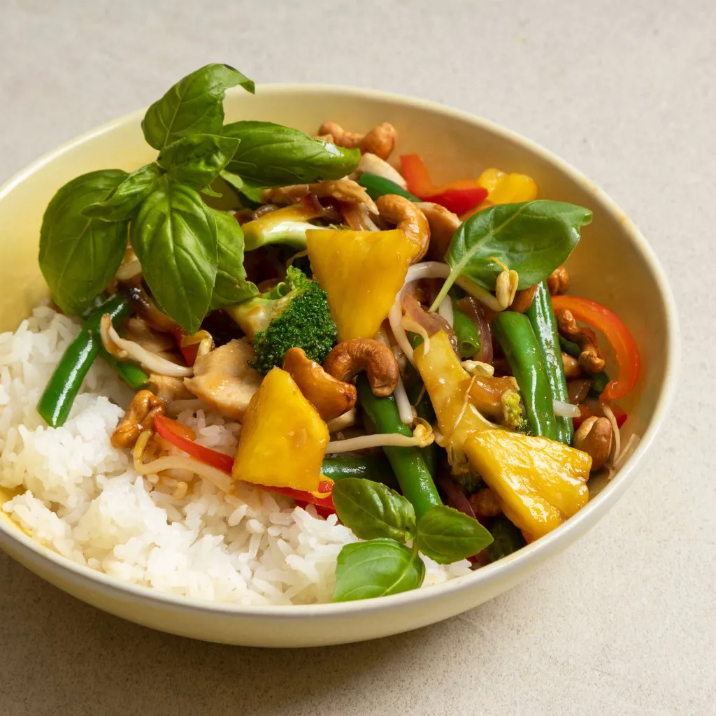 Remove the pan from heat. Serve with rice and scatter with remaining basil leaves and cashew nuts.