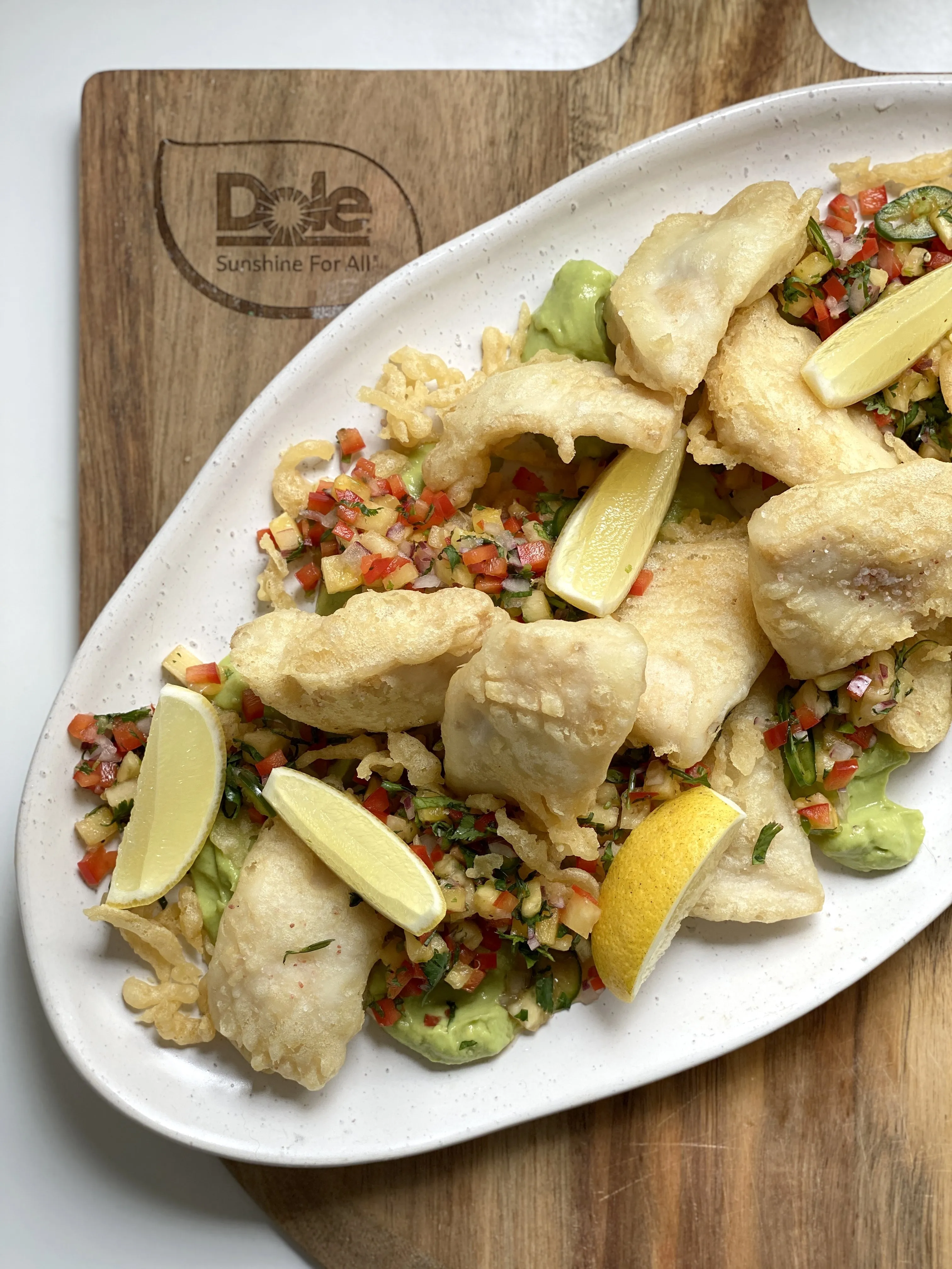 Cut fish into even bite sizes. Combine all the pineapple salsa ingredients. Blend avocado puree until smooth.