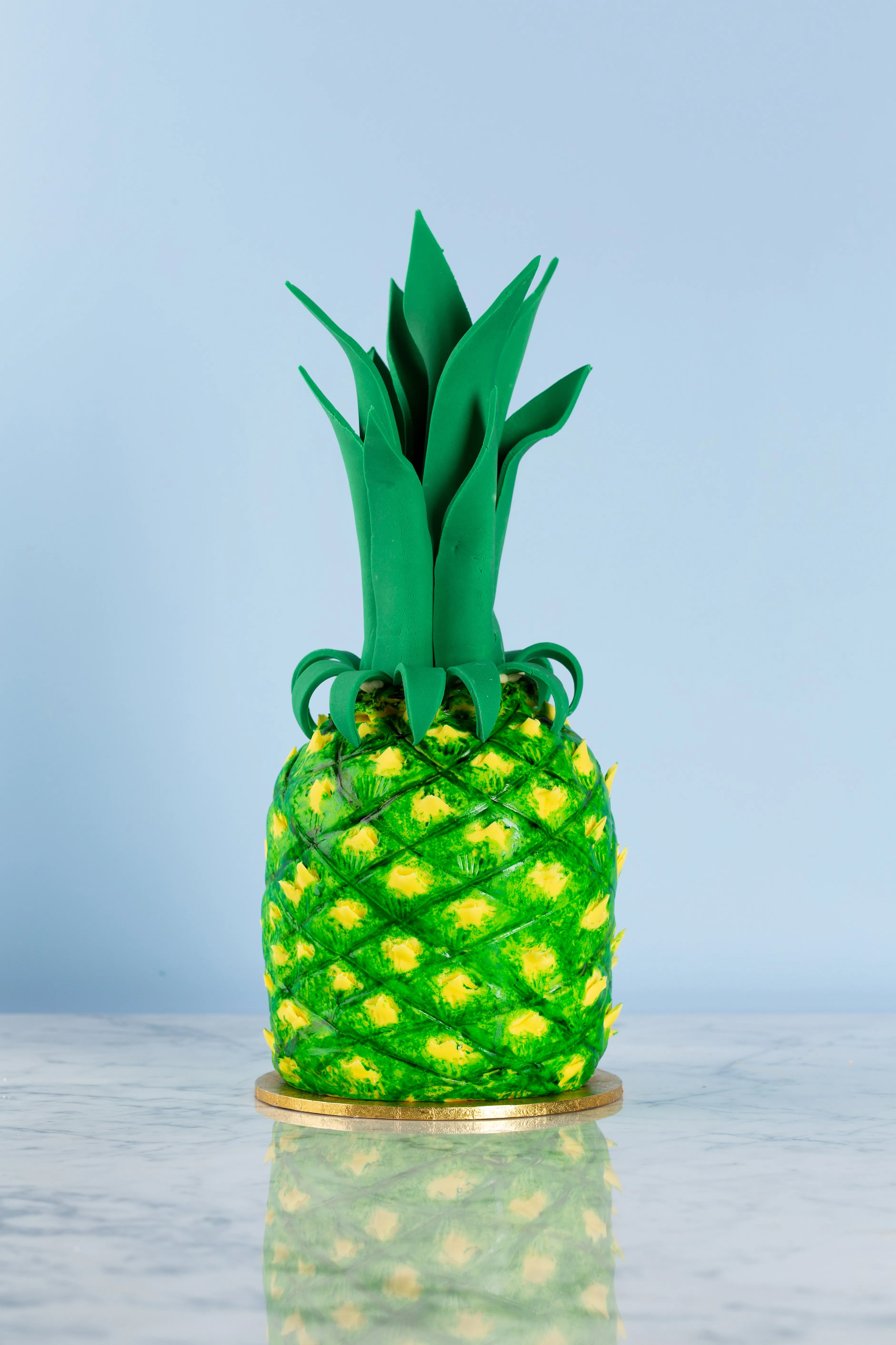 10. To arrange the crown of leaves, press the larger leaves into the top of the pineapple cake, in a circle. To give the leaves some support, take a leftover ball of green fondant and press it inside the circle of leaves. Use buttercream icing as glue to hold the leaves in place. Attach medium-sized leaves in a circle around the outside of the big leaves, sticking them on with buttercream. Next attach the smaller curled leaves in a crown around the base.