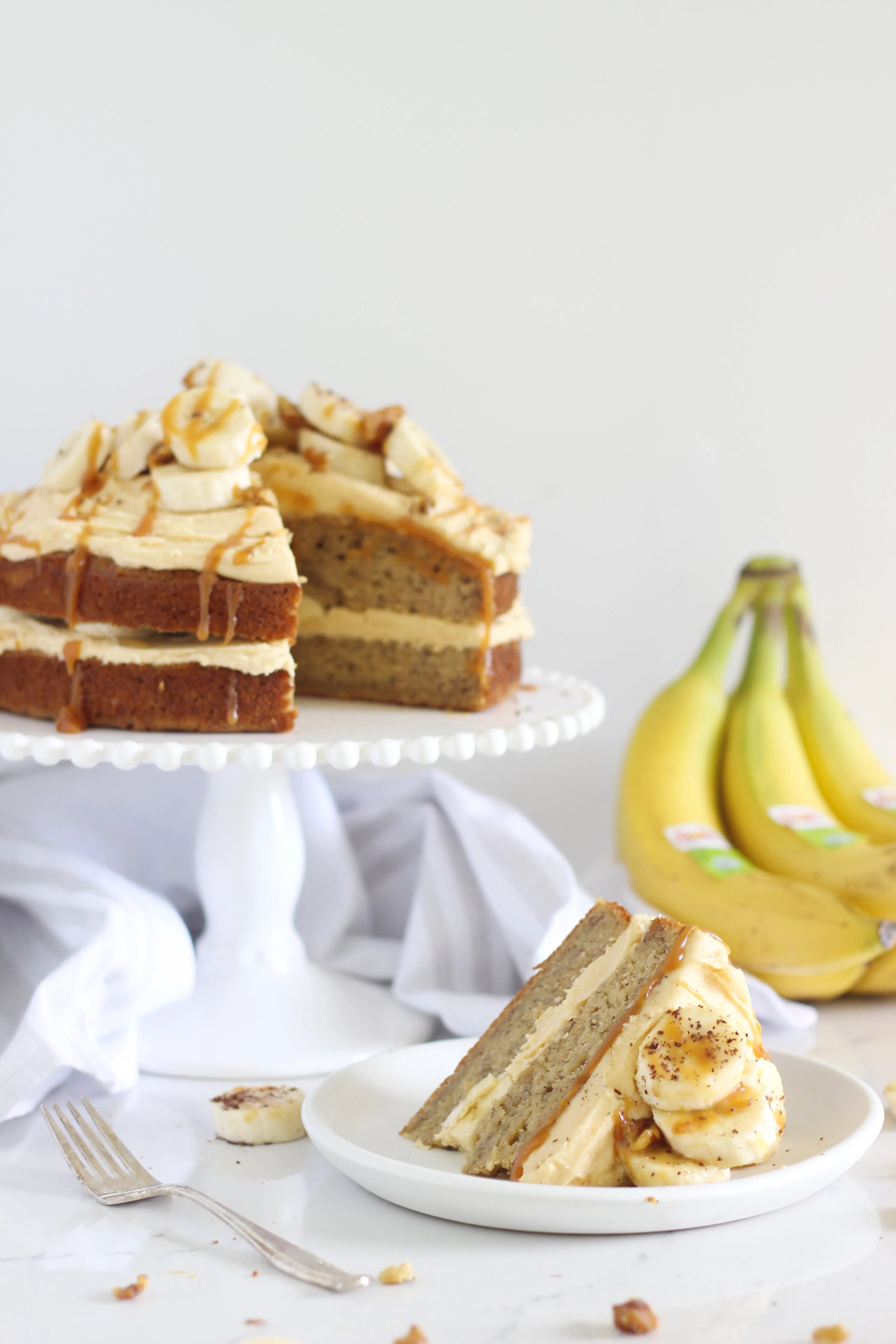 - Spread remaining frosting on the top of the cake and cover in sliced bananas and chopped walnuts.