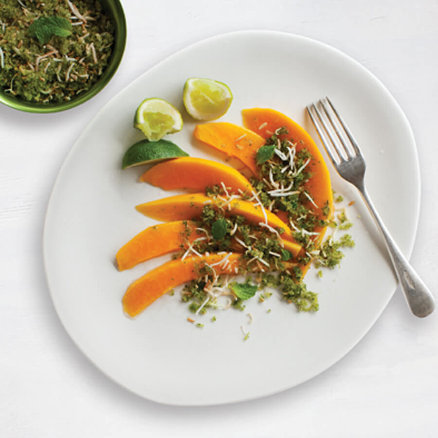 - Sprinkle the mint and coconut sugar over the pawpaw and serve with lime wedges to squeeze over.