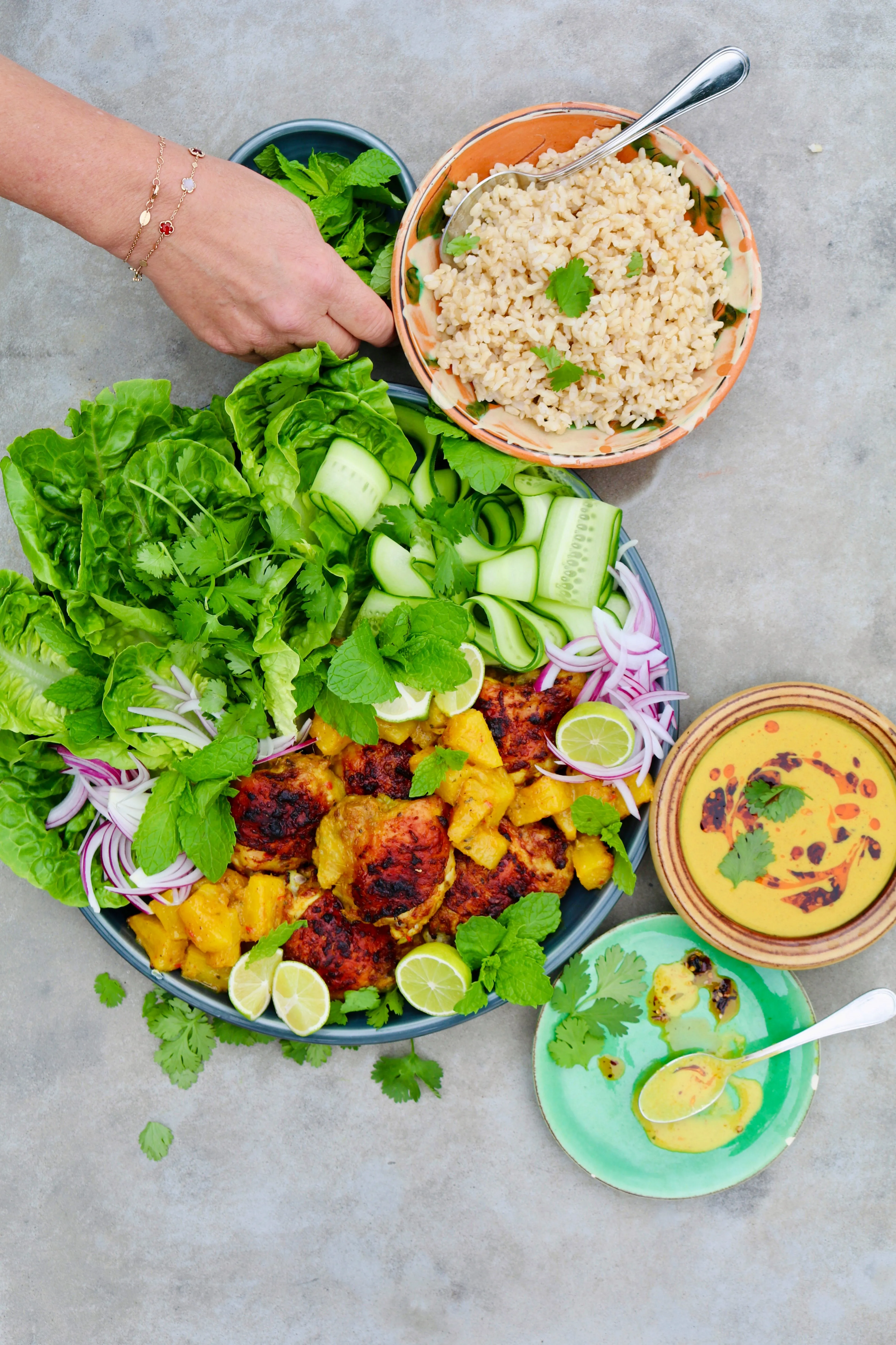 Serve the chicken & pineapple with rice, sauce, veggies, herbs and chili oil inside the lettuce cups.