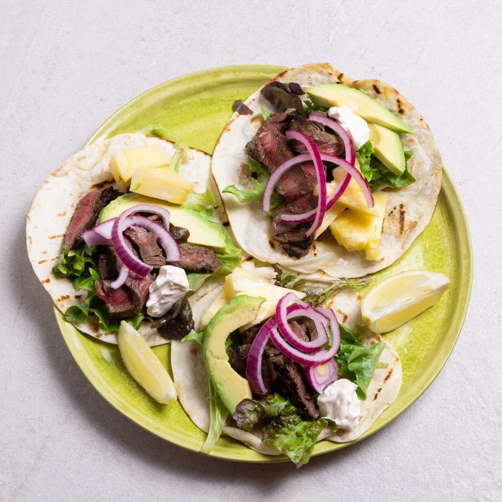 Layer each tortilla with a mound of leaves, slices of beef, fresh pineapple, avocado, a dollop of sour cream and quick pickled red onions.