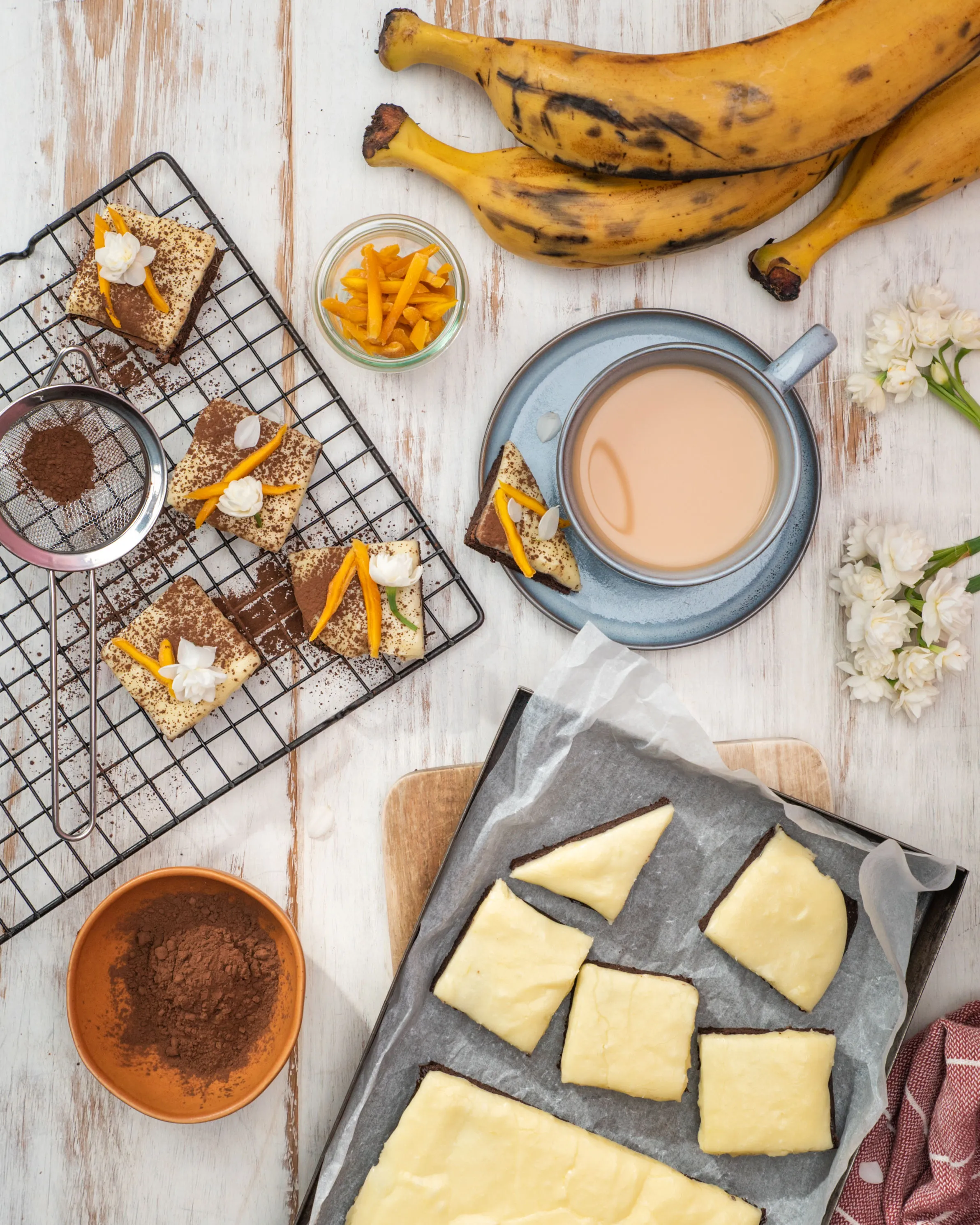 5. Allow to completely cool in the pan before spreading over the mango frosting, dusting with the extra cocoa powder and sprinkling with the chopped mango.