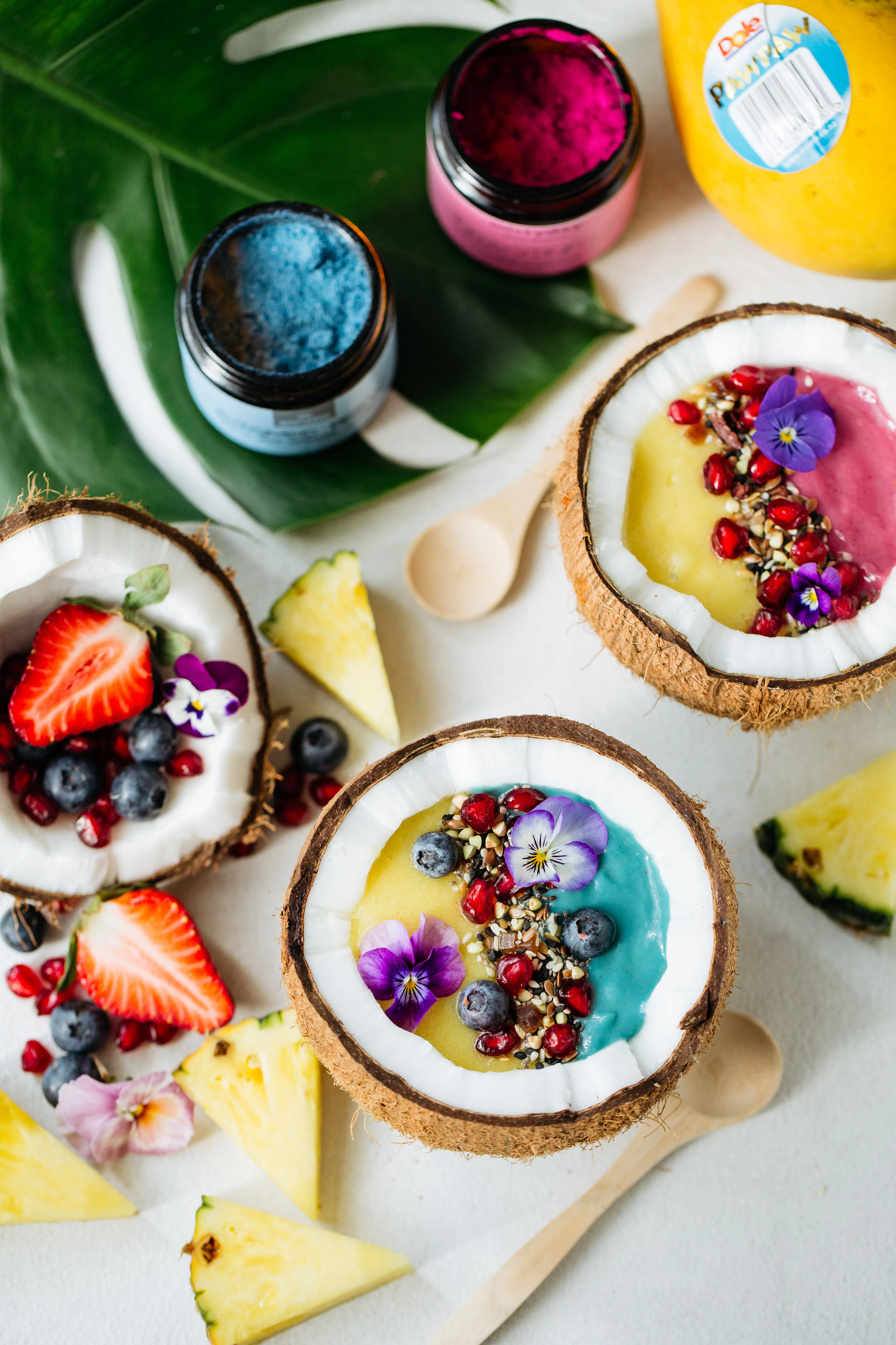 Pour two colour mixes into coconut halves pouring at the same time to create the effect of two halves.