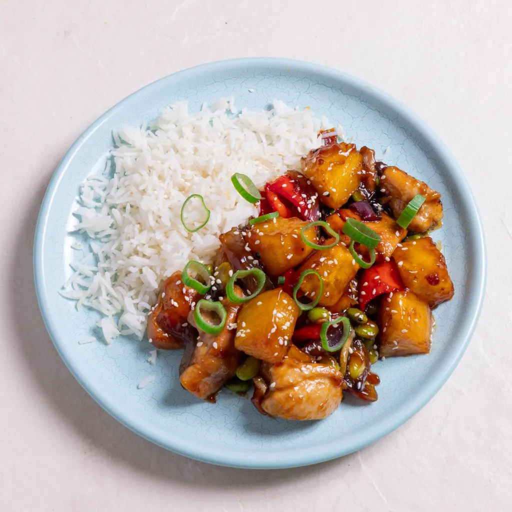 Add the pineapple, red onion, capsicum and edamame to the pan with the chicken and drizzle over enough teriyaki sauce to coat the chicken and vegetables.