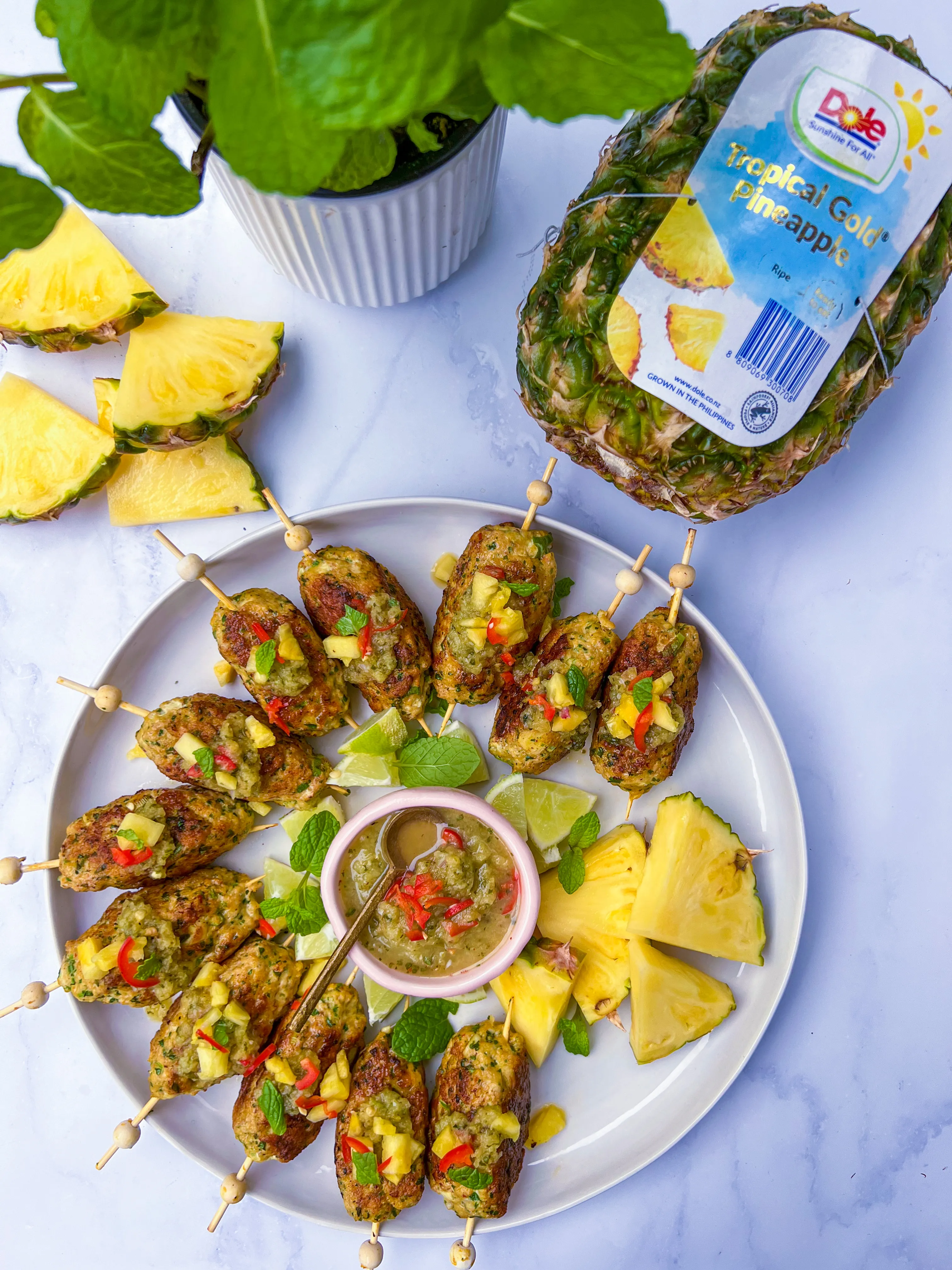Place onto a serving platter and spoon over some of the pineapple sauce. Garnish with fresh mint, extra diced pieces of fresh pineapple & chilli.