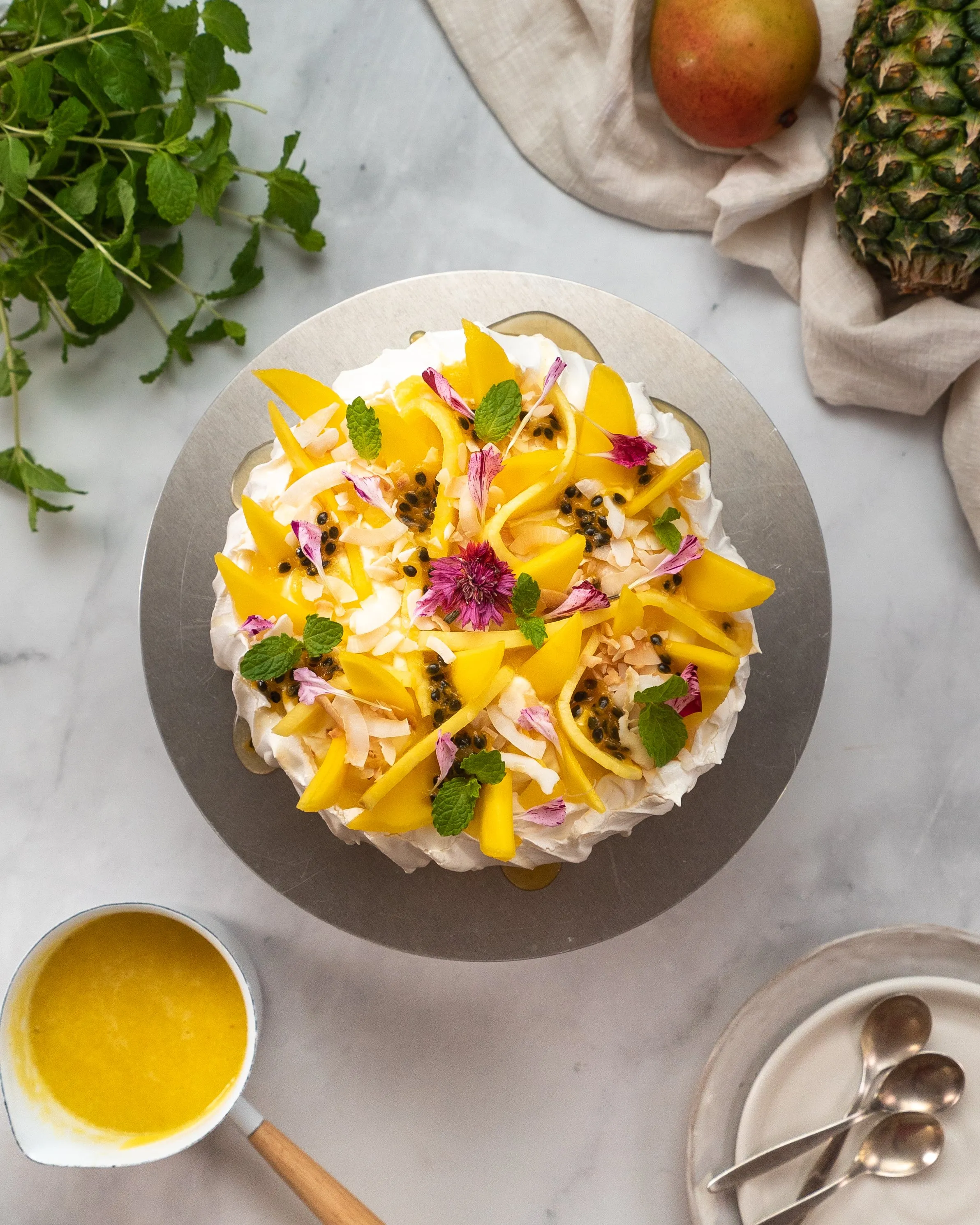 6. To serve: Serve the pavlova decorated with prepared toppings and a drizzle of tropical coulis. Yum!